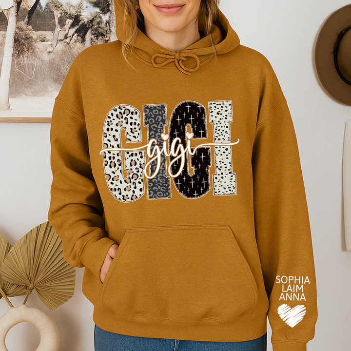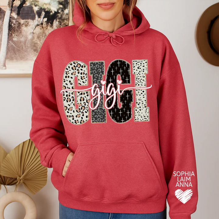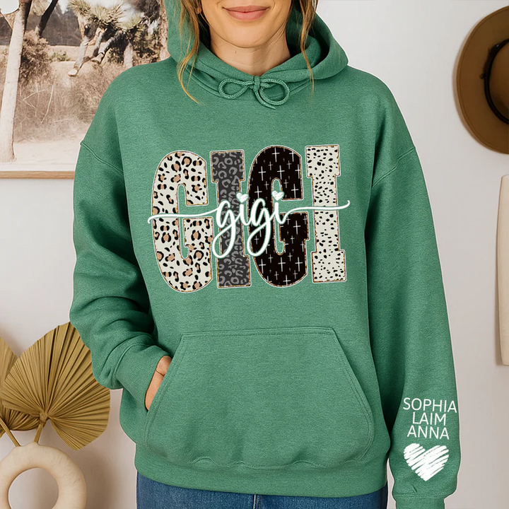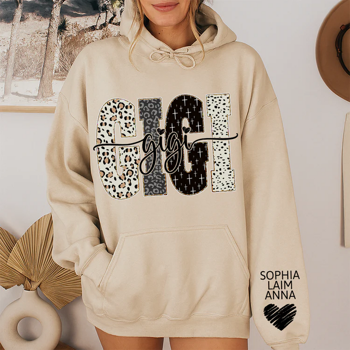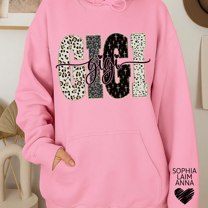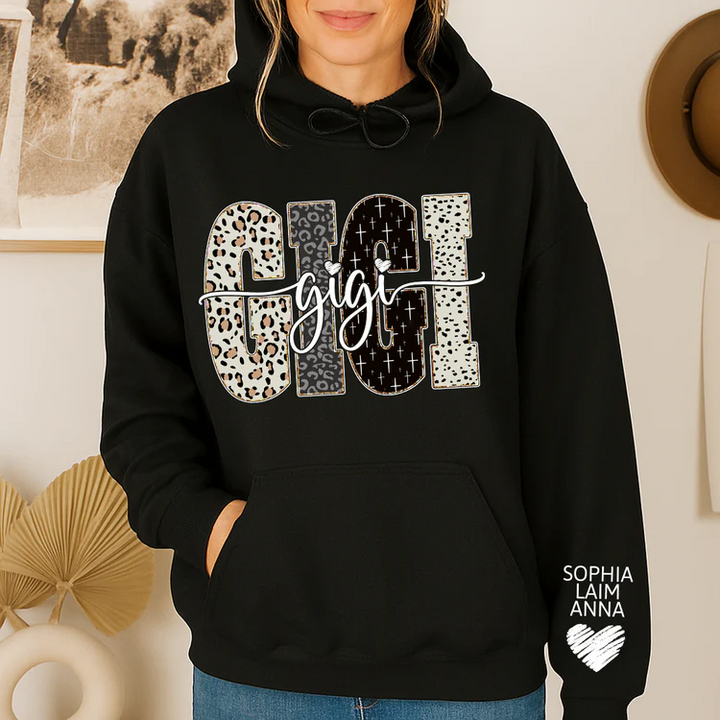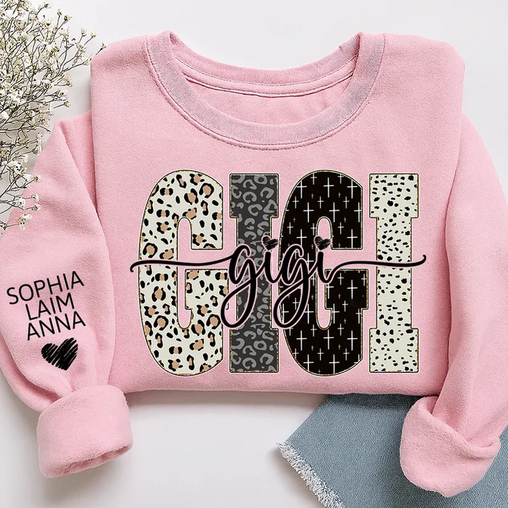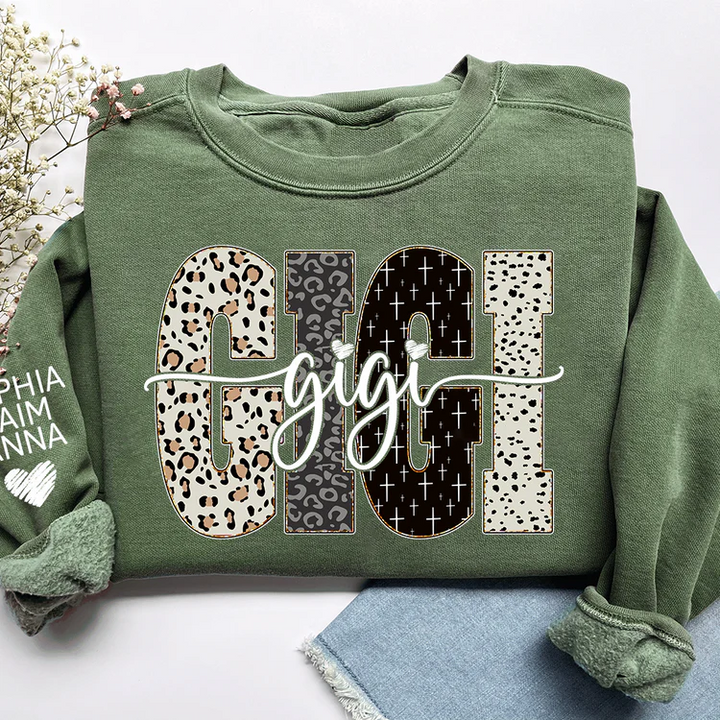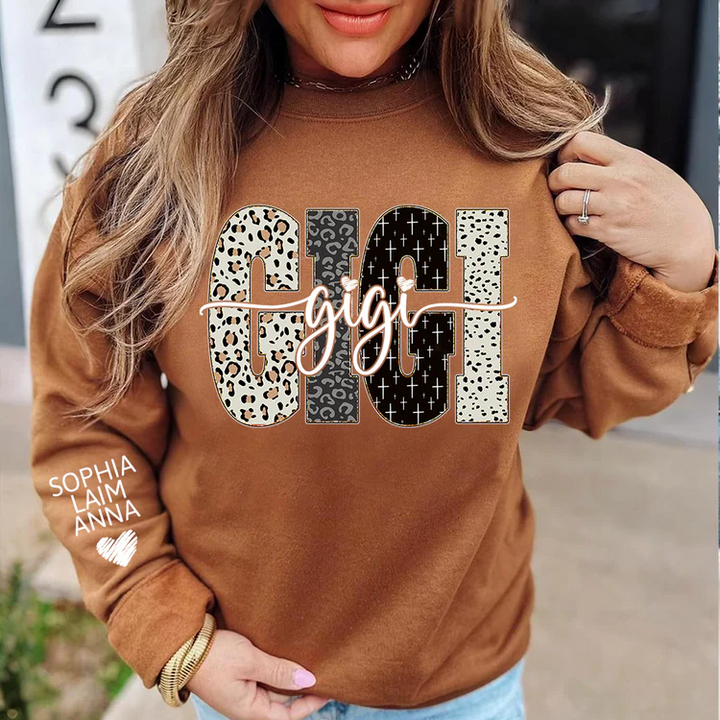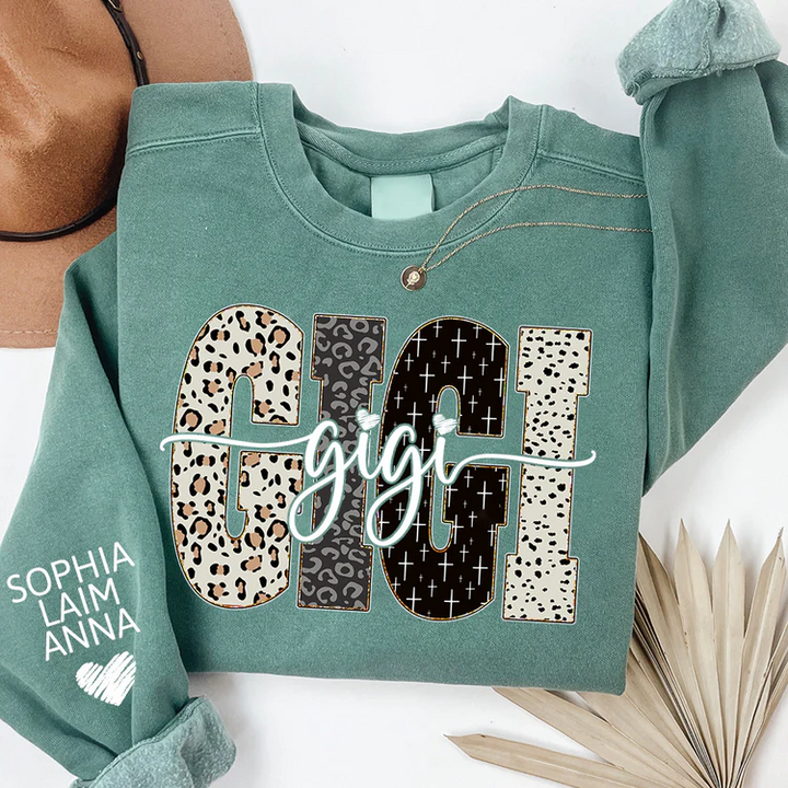 Personalized Gigi Sweatshirt – Animal Print Letters with Custom Grandkids’ Names on Sleeve