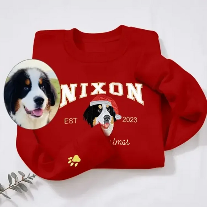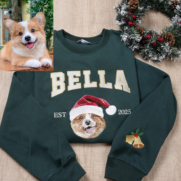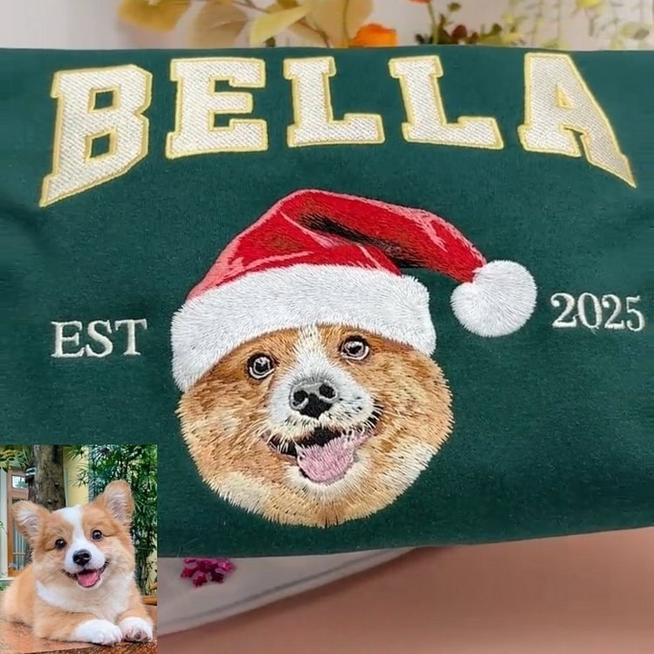 OurĀ Custom Embroidered Pet Portrait SweatshirtĀ turns your favorite photo into a beautifully detailed embroidery, framed with festive Christmas patterns for the perfect seasonal look.