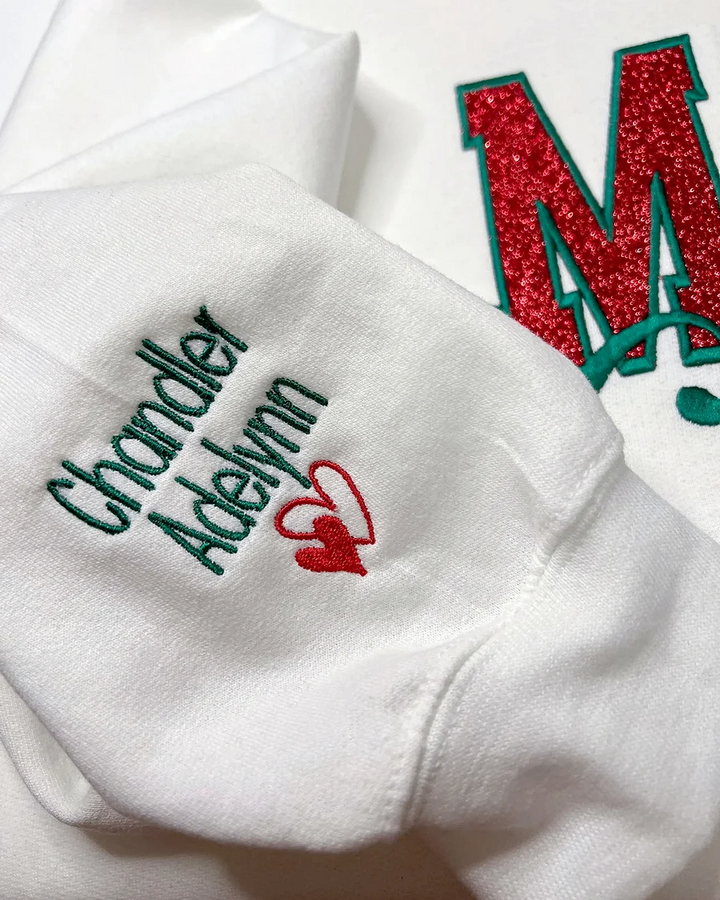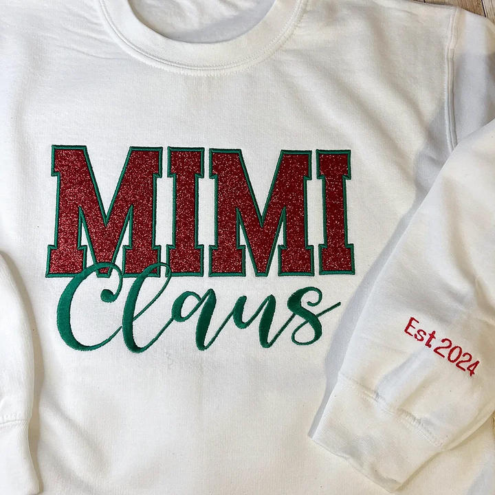 Custom Embroidered Glitter Appliqué Gigi Mimi Mama Claus Sweatshirt with Names on Sleeve