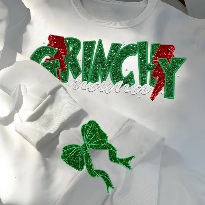 Custom Embroidered Glitter Side Bow Cut-Out Grinchy Christmas Mama Sweatshirt