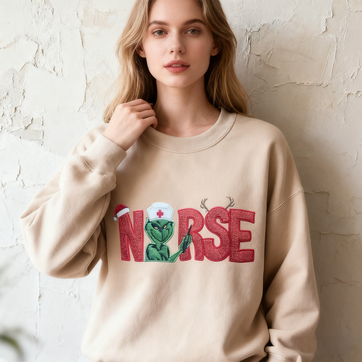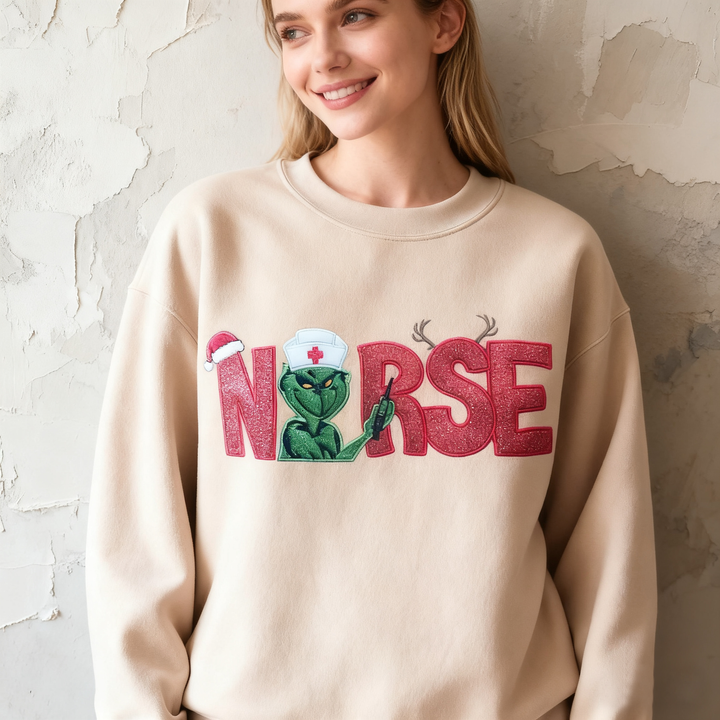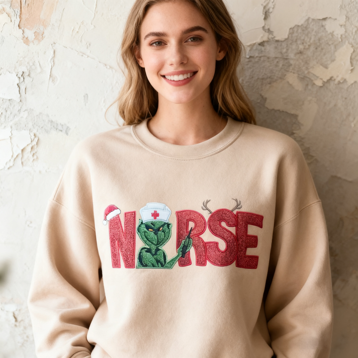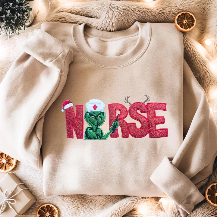 Custom Glitter Embroidered Christmas Nurse Grinch Sweatshirt