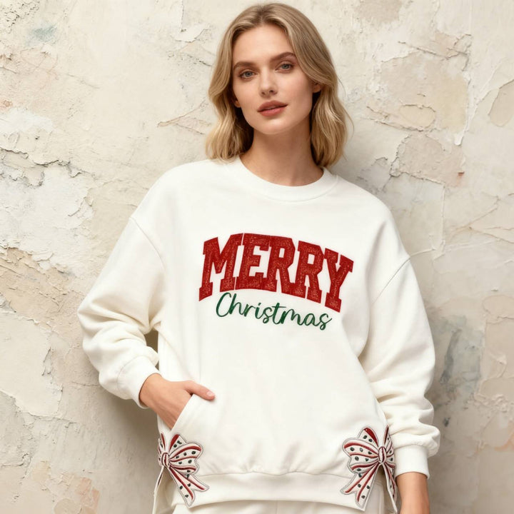 Custom Merry Christmas Glitter Sweatshirt with Bow, Holiday Outfit for Women