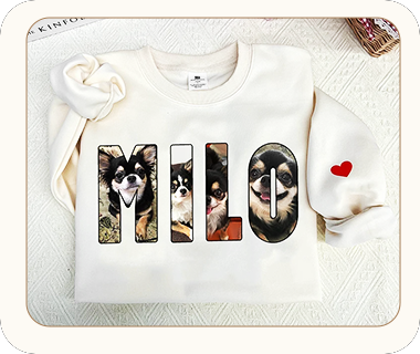 Celebrate your furry friend in the coziest way possible! Our personalized sweatshirt (also available in hoodie and T-shirt styles) features your pet's photos creatively arranged within bold letters spelling out their name.