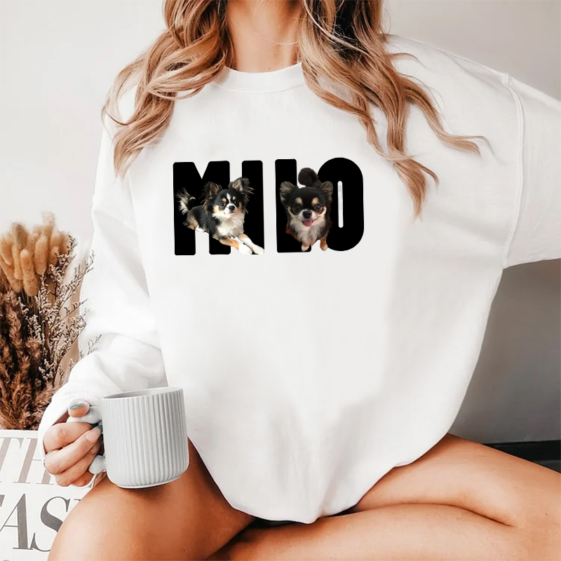 Celebrate your furry friend in the coziest way possible! Our personalized sweatshirt (also available in hoodie and T-shirt styles) features your pet's photos creatively arranged within bold letters spelling out their name.