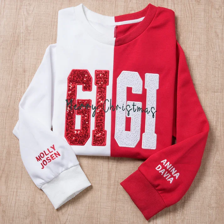 💖Custom Two Tone Sequins Mama Sweatshirt Christmas Split Fashion Embroidered Hoodie🌲