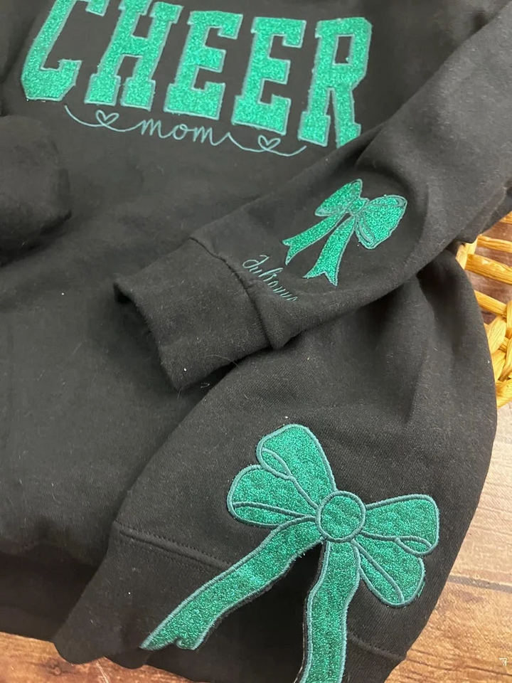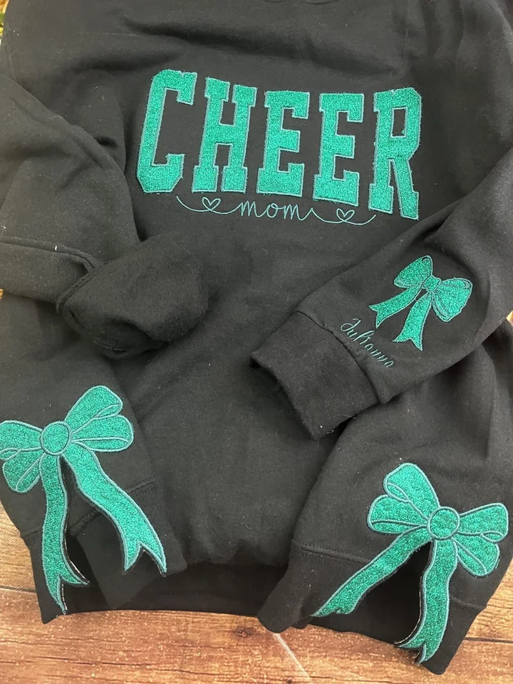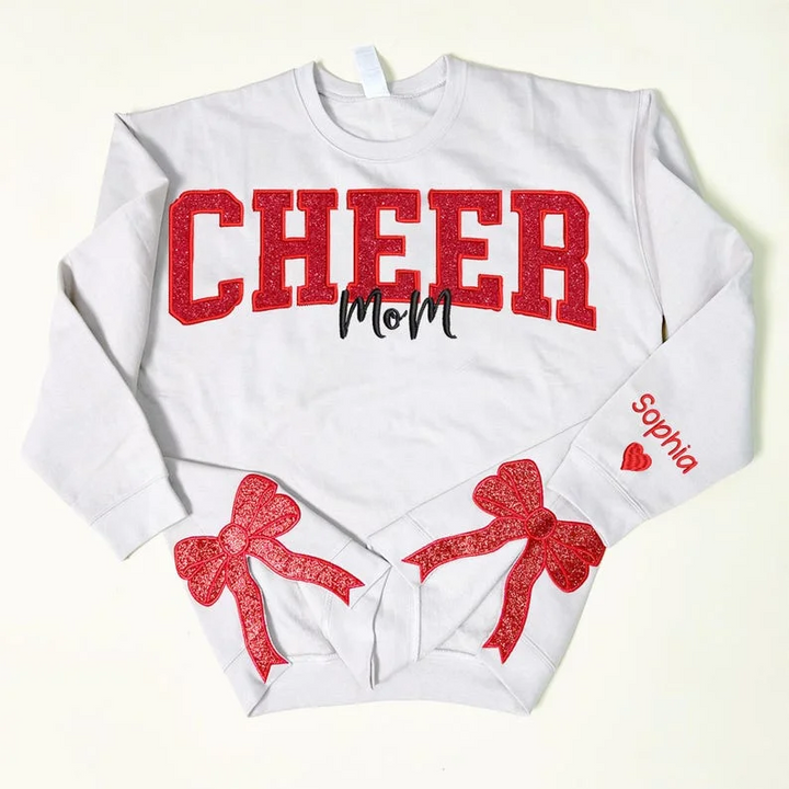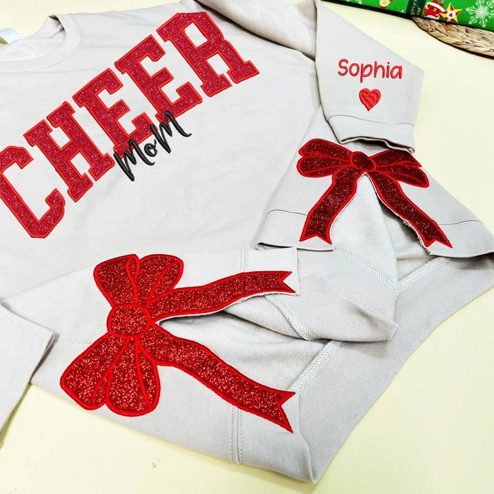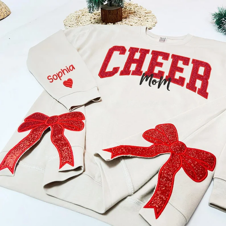Customize Cheer Mom Glitter Sweatshirt with Side Bow & Sleeve Embroidery