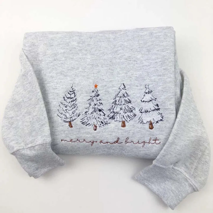 Deck your hallsâand your wardrobeâwith the coziest holiday cheer! Our Merry & Bright Christmas Tree Embroidered Crewneck features four beautifully detailed Christmas trees stitched with precision and love, each adorned with shimmering accents and festive colors. Whether you're trimming the tree, sipping cocoa, or spreading joy at a holiday party, this sweatshirt is your ultimate seasonal stapleâblending timeless embroidery with modern comfort.