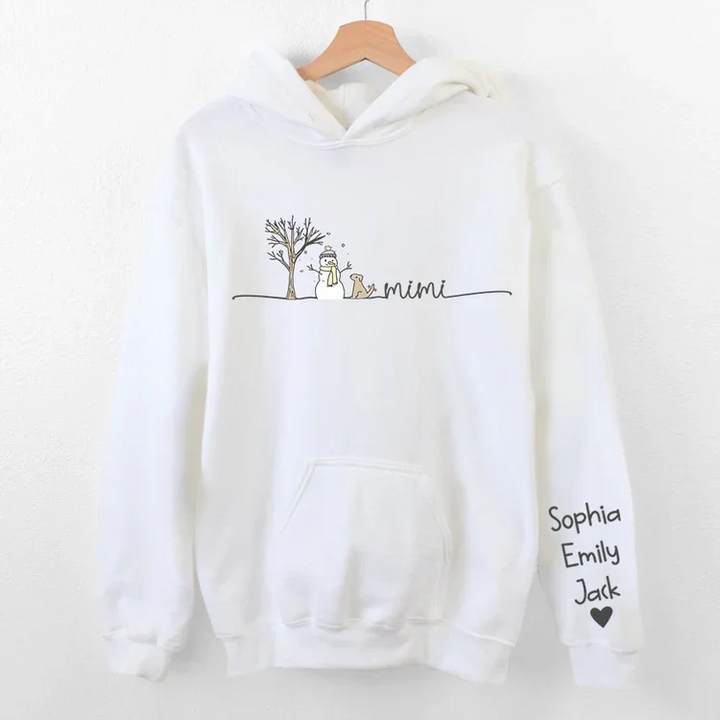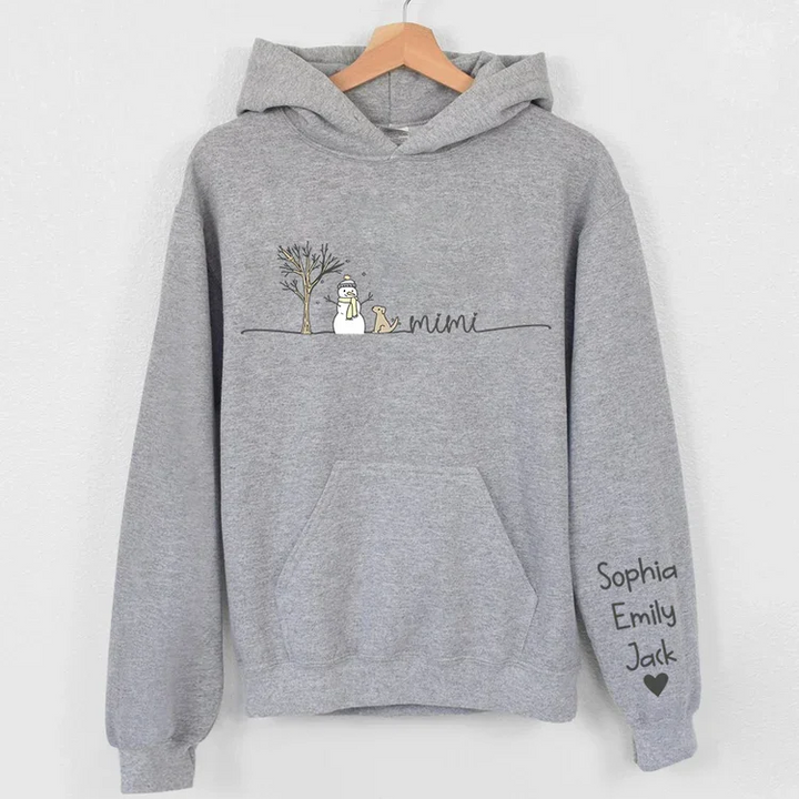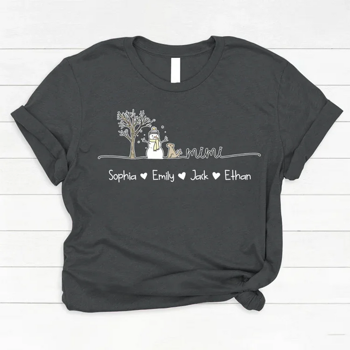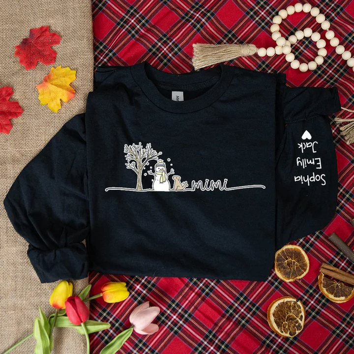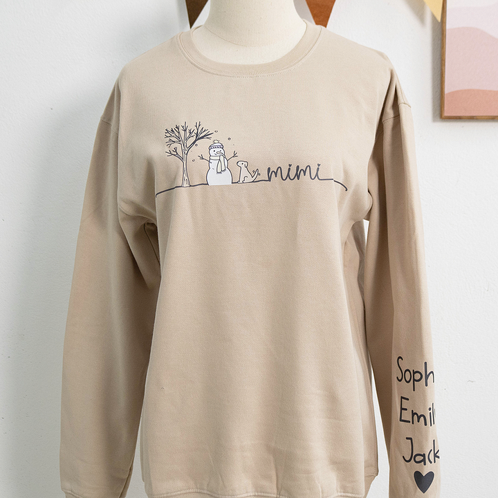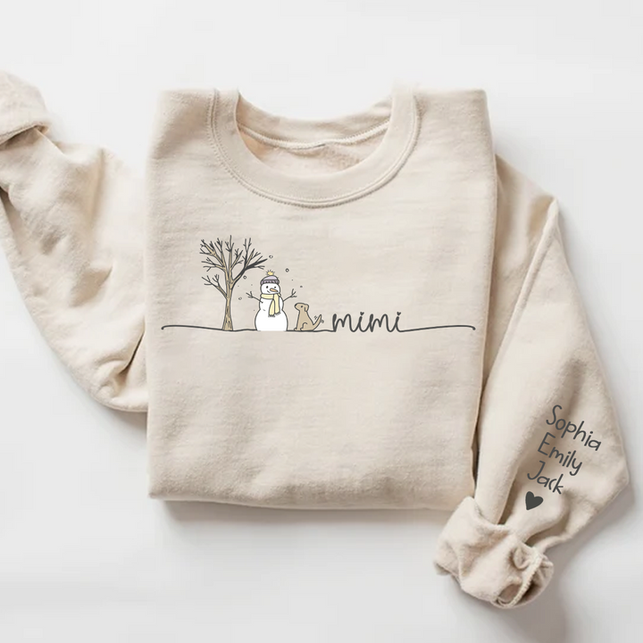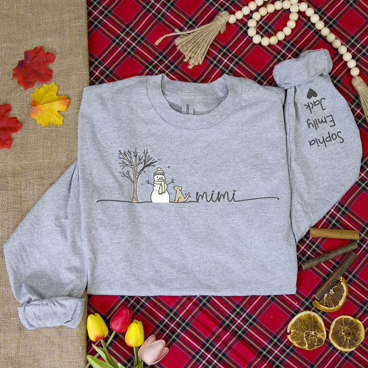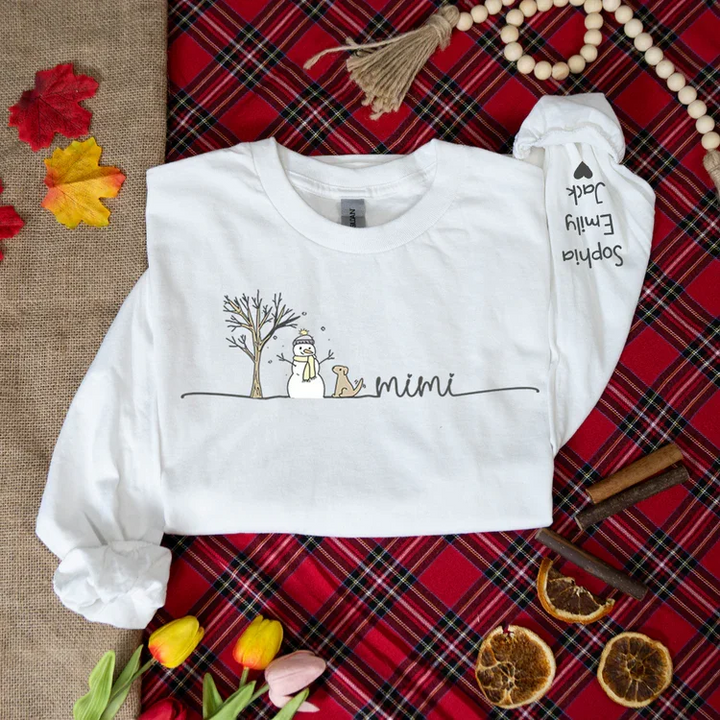 Celebrate the special bond between Mimi and her grandkids with this heartwarming Mimi Christmas Snowman Sweatshirt. Featuring a charming, minimalist snowman design alongside a cozy winter scene, this sweatshirt is perfect for creating cherished holiday memories. Personalized with the names of her grandkids on the sleeve, it’s more than just an item of clothing—it’s a reminder of the love that warms every season.