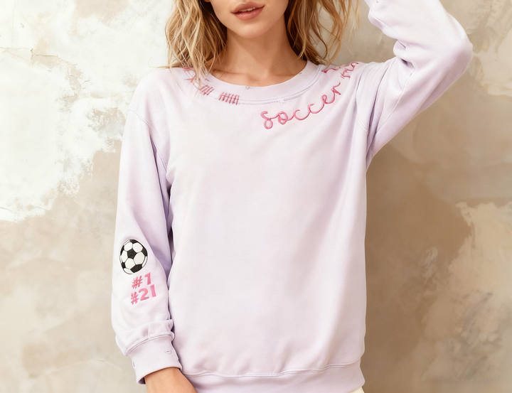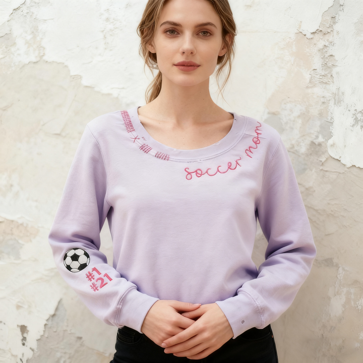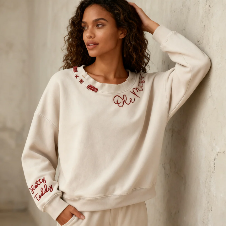 Introducing our One-of-a-kind Vintage Inspired Custom Embroidered Sweatshirt! Hand-distressed to perfection, this stylish sweatshirt is the perfect addition to any wardrobe. The machine-embroidered neckline adds a touch of elegance to this already unique piece, while the hand-embroidered stitching details make it truly one-of-a-kind.